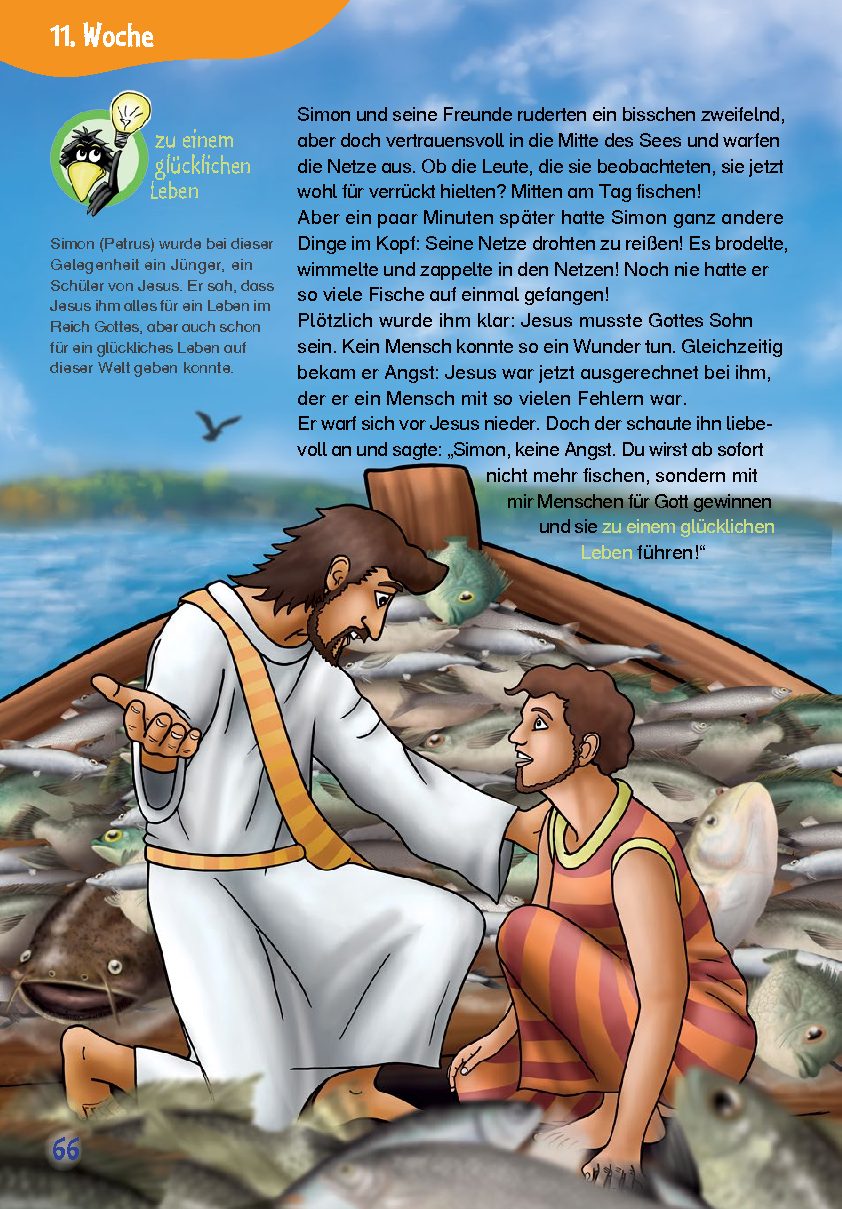 In der Bibel warten viele Schätze darauf, entdeckt zu werden. Es gibt spannende Geschichten, geheimnisvolle Bilder und viele interessante Vergleiche. Die Schatzkiste hilft den Kindern, diese Schätze der Bibel zu entdecken. Ein lustiger Rabe zeigt dabei, worum es im Heft gerade geht und was von den Kindern gemacht werden soll. So weist er auf die „Heiße Bibelspur“ genauso hin wie auf das „Bibelentdecker-Quiz“. Unter „Wusstest du?“ gibt er Erklärungen zur biblischen Geschichte, und wenn der Rabe dazu anregt, zu überlegen, was die biblische Geschichte mit dem Leben der Kinder zu tun hat, dann nennt er das „Voll im Leben“.